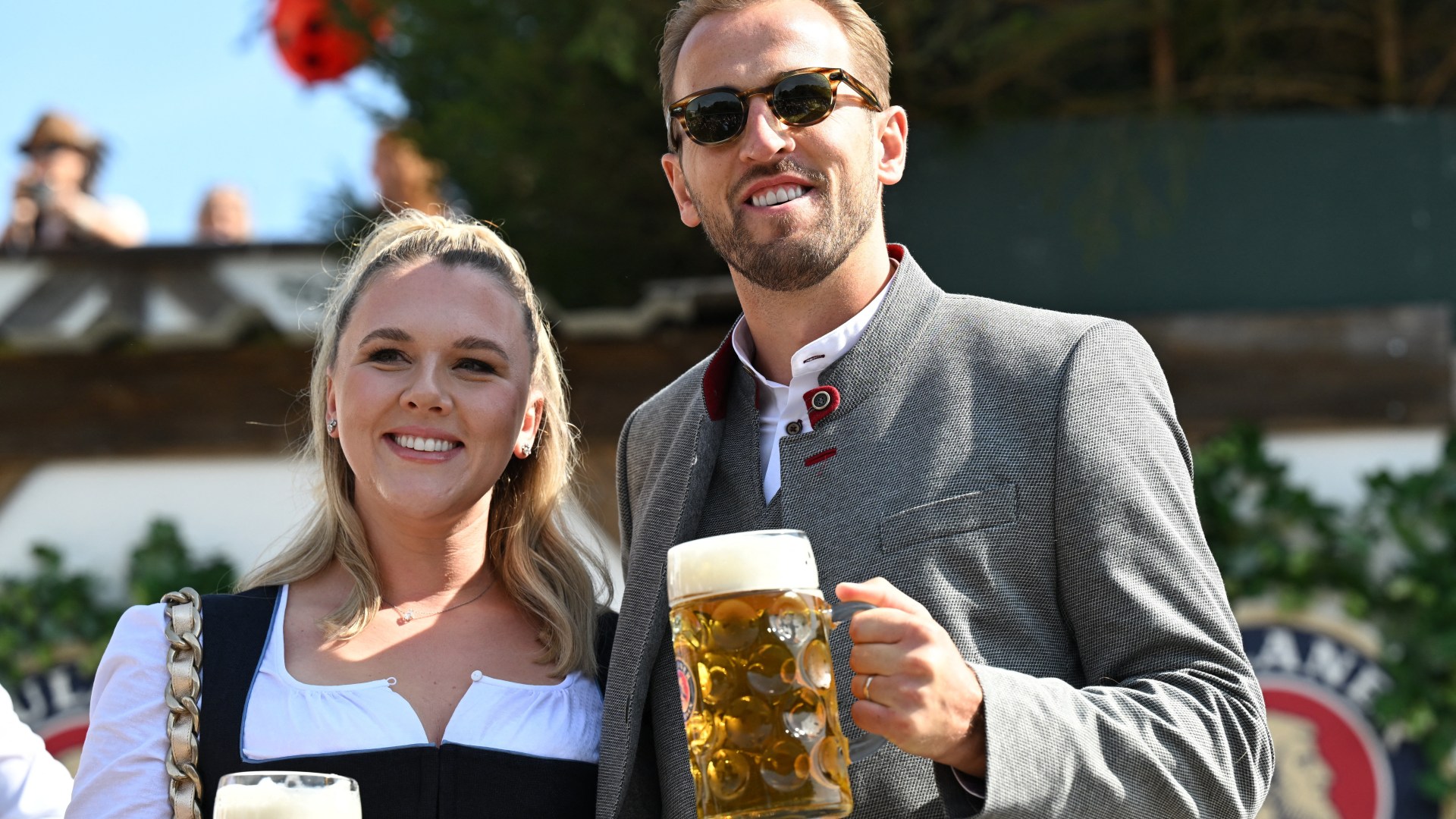 Harry Kane fica preso em uma caneca de cerveja na Oktoberfest de Munique enquanto sua esposa o acompanha nas festividades