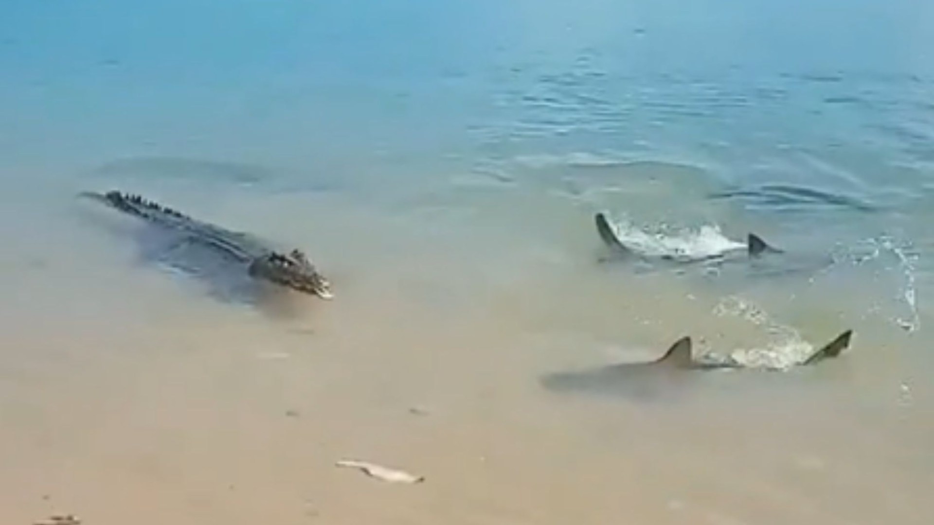 Assista ao momento horrível em que crocodilo enfrenta gangue de TUBARÕES em batalha brutal para ser o rei da praia